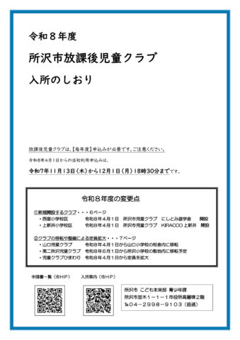所沢市ホームページ内 令和8年度 放課後児童クラブ入所申込書類ダウンロードはこちら